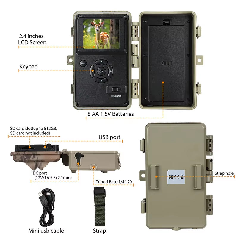 The camera supports SD cards up to 512GB capacity, storing thousands of high-resolution images and hours of HD video footage for extended monitoring without frequent card changes.